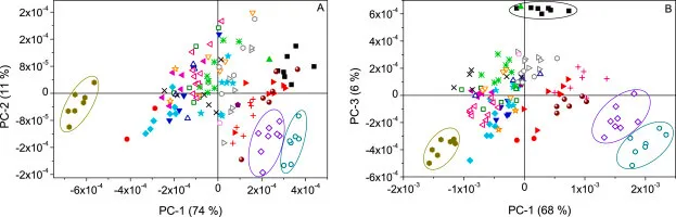 Two low/cost, miniaturized near/infrared (NIR) spectrophotometers working in two different spectral ranges (900-1700 nm and 1300-2500nm) and employing different spectrometric technologies were evaluated to assess several traits of ground roasted commercial coffees, using multivariate analysis. The comprehensive sample set comprised one hundred forty/five samples from different origins, blends of varietals (arabica/arabica, and arabica/robusta) or pure varietal (arabica), decaffeinated or regular, presenting several grades of sensorial traits (bitterness, intensity, acidity, body, and roast degree), as informed by the manufacturing company. Representative spectra of the samples were acquired using a probing device providing rotational and linear displacement of the sample vial. The spectral data set was evaluated using principal component analysis (PCA) models aiming to verify the discrimination capability of both instruments. When evaluated down to the fourth principal component by both compact instruments, origin, varietal, decaffeinated, and regular coffees are grouped and well/differentiated by the PCA scores. Differences among batches of the same coffee brand can be observed. Quantitative models based on partial least square (PLS) regression were evaluated to assess the feasibility of miniaturized spectrophotometers to determine the samples' intensity, bitterness, body, roast, and acidity traits. These sensorial traits can be predicted by partial least square models with root mean square errors of external validation of 1.3, 0.7, 0.6, 0.5, and 0.8 and 1.2, 0.7, 0.5, 0.5, and 0.7 for intensity, bitterness, body, roast, and acidity, respectively, using the data sets obtained by the NanoNIR, and the NeoSpectra instruments and employing variables selected by the Jack/Knife algorithm. Quantitative results can be improved using local regression models constructed with a restricted set of samples. Overall, the results reveal the potential of miniaturized, low/cost NIR spectrophotometers to characterize commercial ground roasted coffee qualitatively and quantitatively with a slight advantage of using the instrument providing the more comprehensive wavelength range and based on Fourier transform technology.